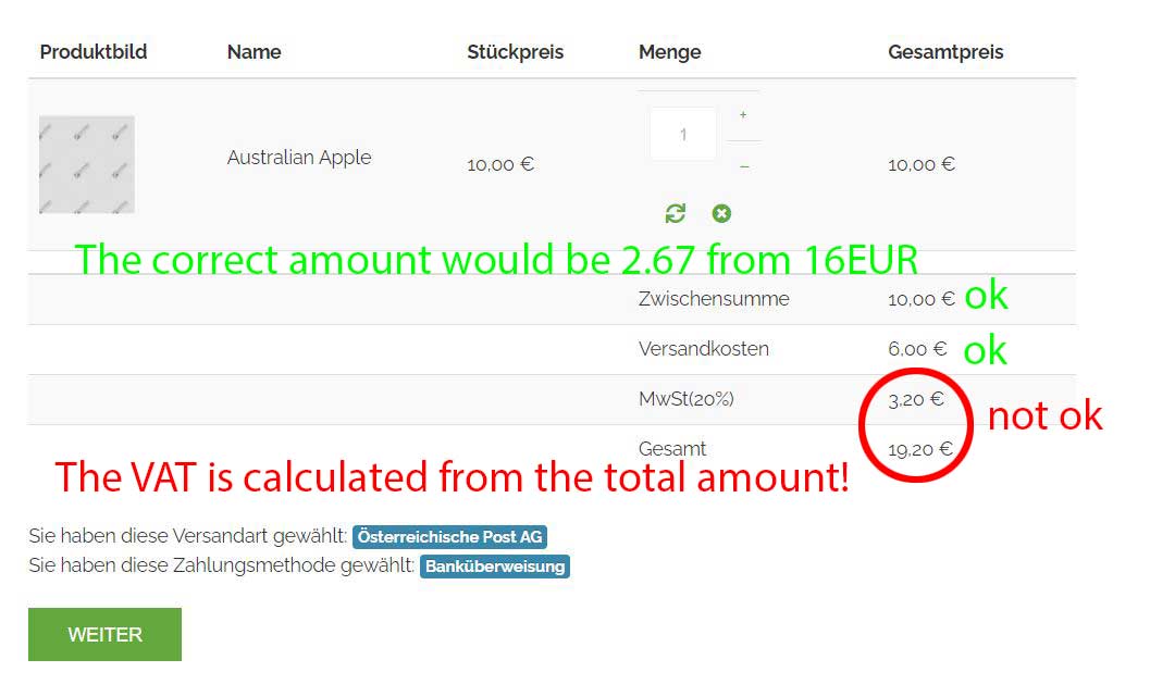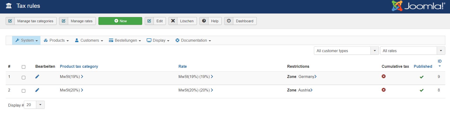Also, I can see that you selected the tax category MWst 20% in your product. That means that only the tax rules with that tax category selected will be taken into account on the frontend. However, one of your tax rule, you've selected another tax category. This means that this tax rule will never be used for that product.