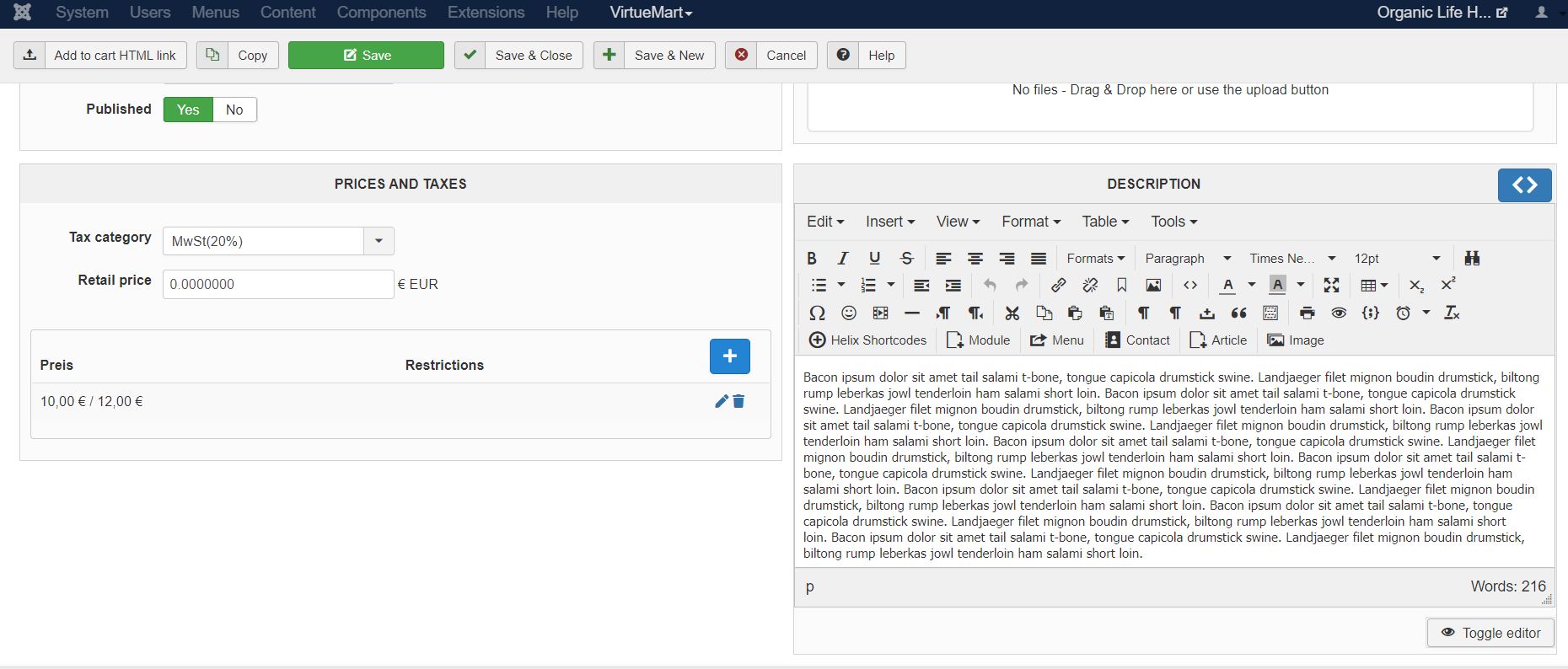 Now, if you want the price with taxes displayed to the customer to be always 10, regardless of where they are based, and then that the tax is calculated dynamically off of it, then you want to activate the "floating tax prices" setting in the HikaShop configuration. And in that case, when you edit the price of a product, you'll see that instead of having both a "price with tax" and a "price without taxes" input there, you'll have only the "price with taxes" input where you'll be able to enter 10.