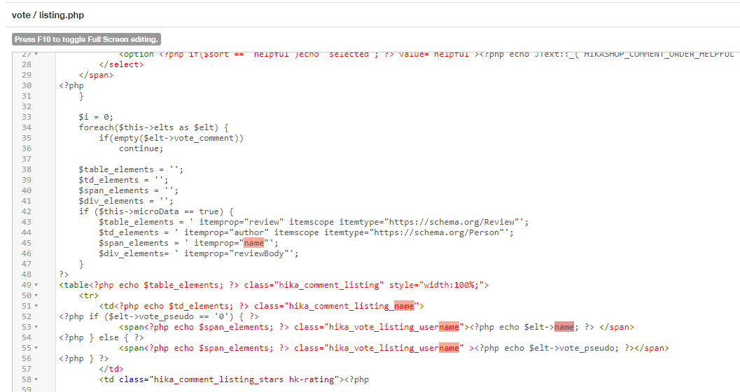 - Now on the listing of comments, it's the username of the customer which is displayed. If you want to change it to the "name" of the user account, you can edit the file vote / listing.php via the menu Display>Views of HikaShop and change the line: