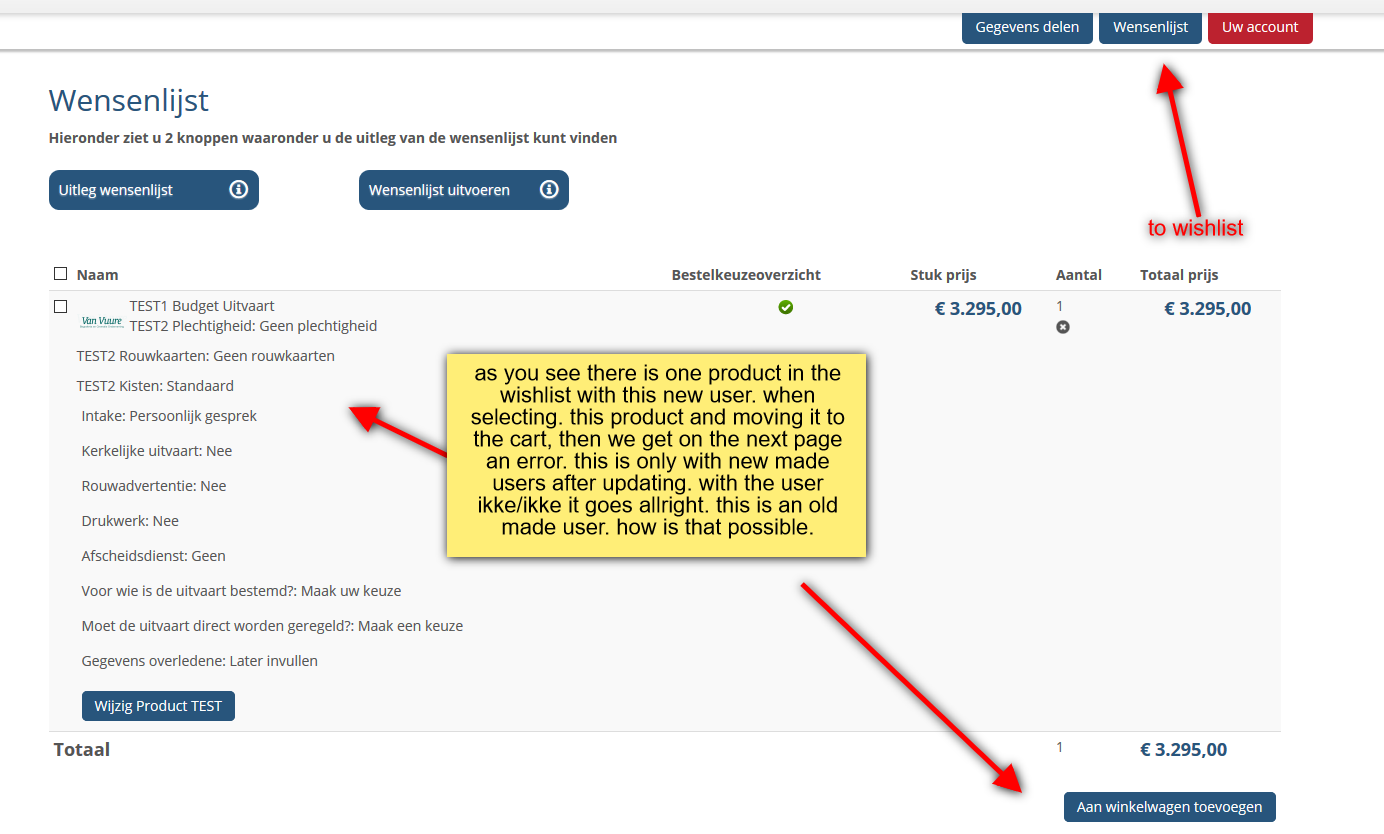 When you go back and select for example this product: hierutest.incunopra.nl/producten-dienste...oduct/basis-uitvaart and put this one into you cart. you have now two products 1 in the cart and 1 in the wishlist. When you now go to the wishlist and put this product into the cart it works? And step 3 of the pdf is working but we do not want multi carts on.