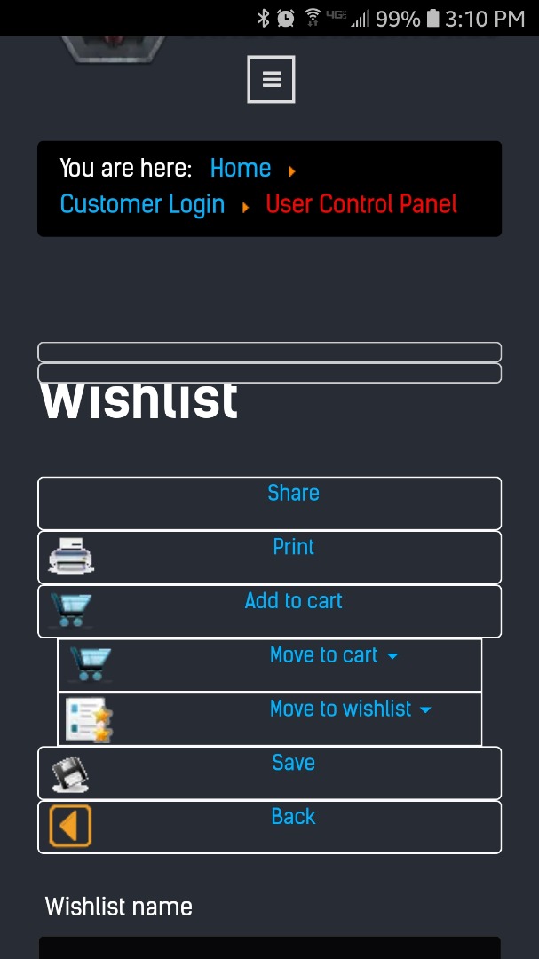 So after some toying around, I've finally got the User Control Panel working, and I made some changes to make the Wishlist buttons display appropriately...but I have an odd issue on mobile that does not show up on a Desktop browser.