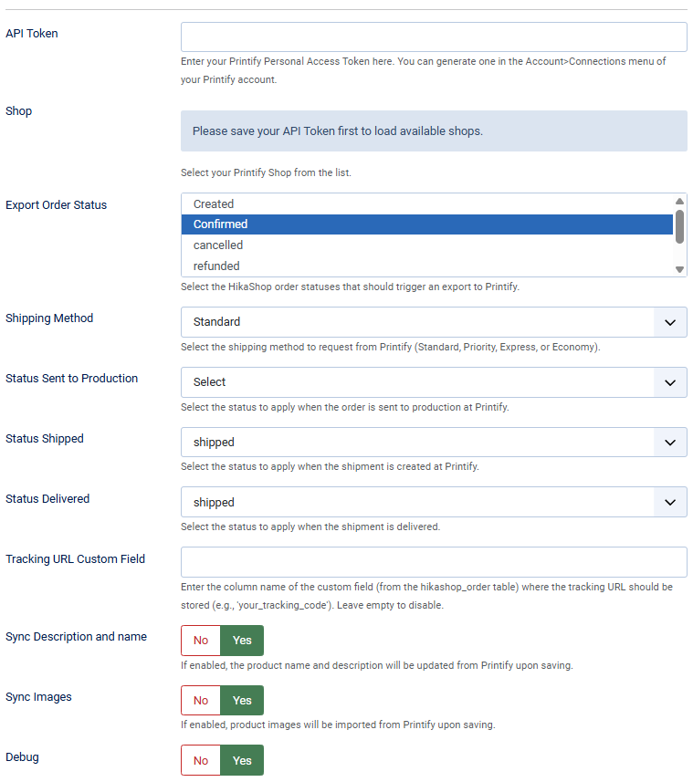 - Real-Time Status Updates: Utilizes secure webhooks to automatically update HikaShop order statuses (to "Shipped" or "Delivered") as soon as they change on Printify.