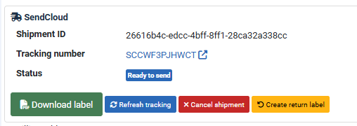 - Full SendCloud panel on the backend order detail page with shipment info, tracking link, status, action buttons (download label, refresh tracking, cancel shipment, create return).