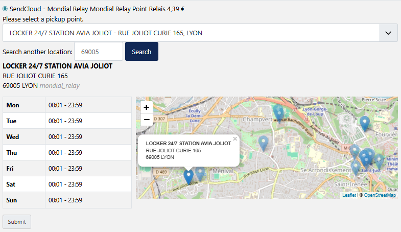 - Service point / pickup point selection at checkout with Leaflet map, postal code search, opening hours, and address details. Service point and locker delivery options are only shown when this feature is enabled.