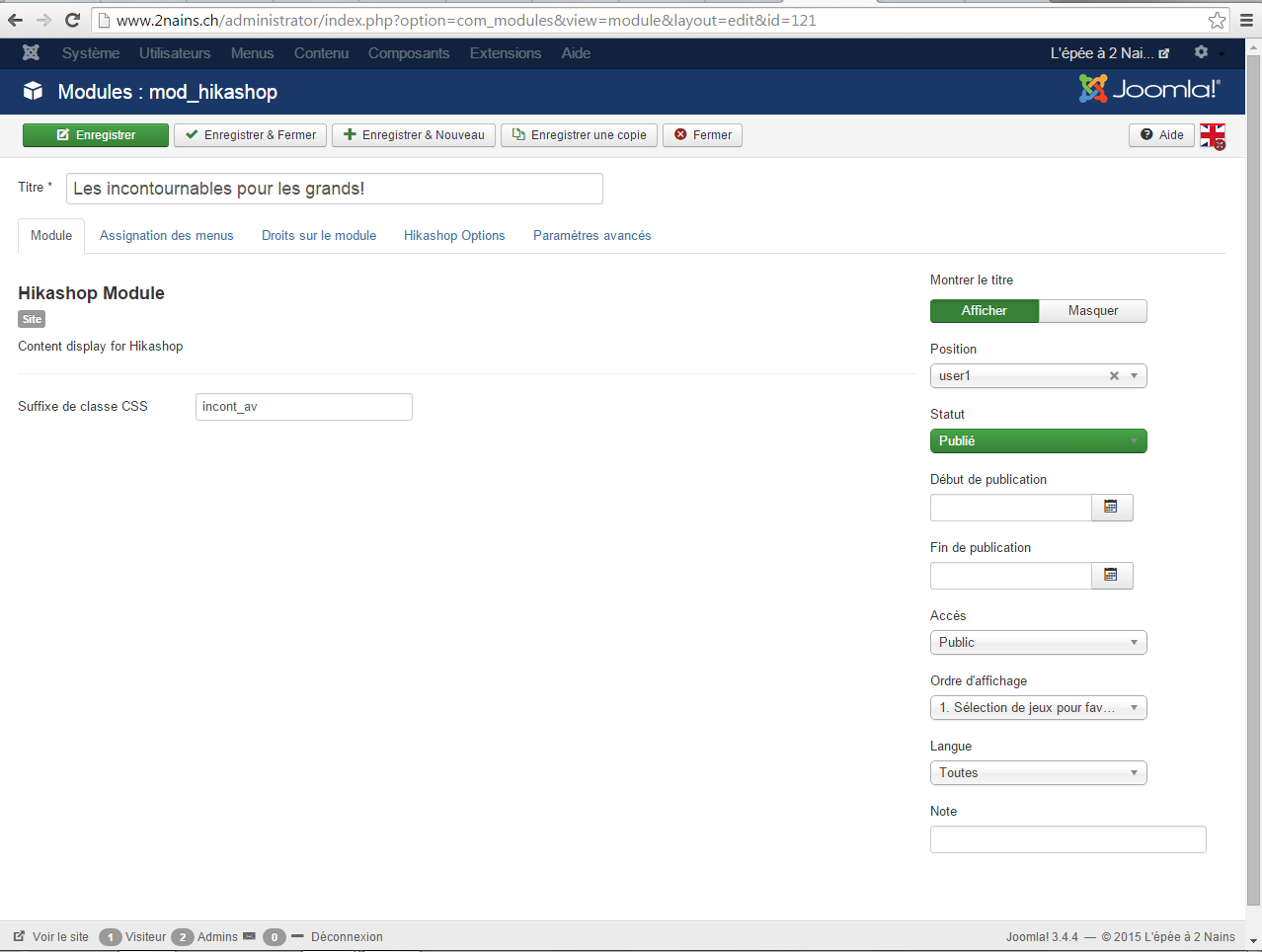 Avec la dernière version de hikashop il y a un bug lorsque l'on essaie de traduire les modules de type "Content display for Hikashop".