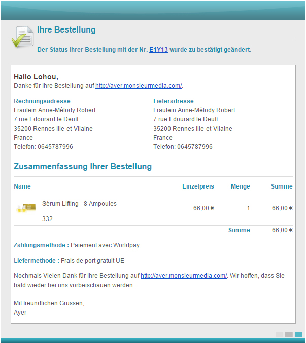 En pièce jointe vous trouverez le mail que l'administrateur reçoit (qui est en Français) et le mail que l'acheteur reçoit (qui est en Allemand).