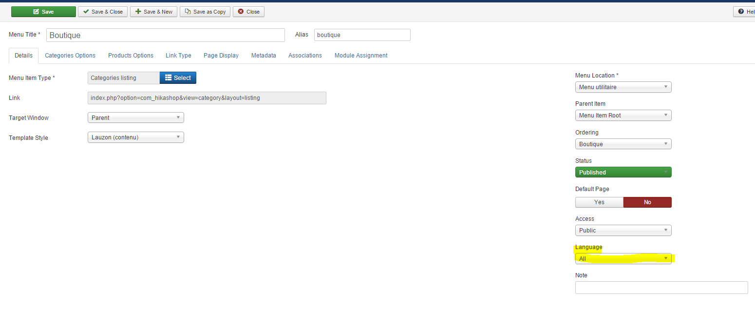 My boutique is tagged with "All language" in the menu configuration in the back end of my site.