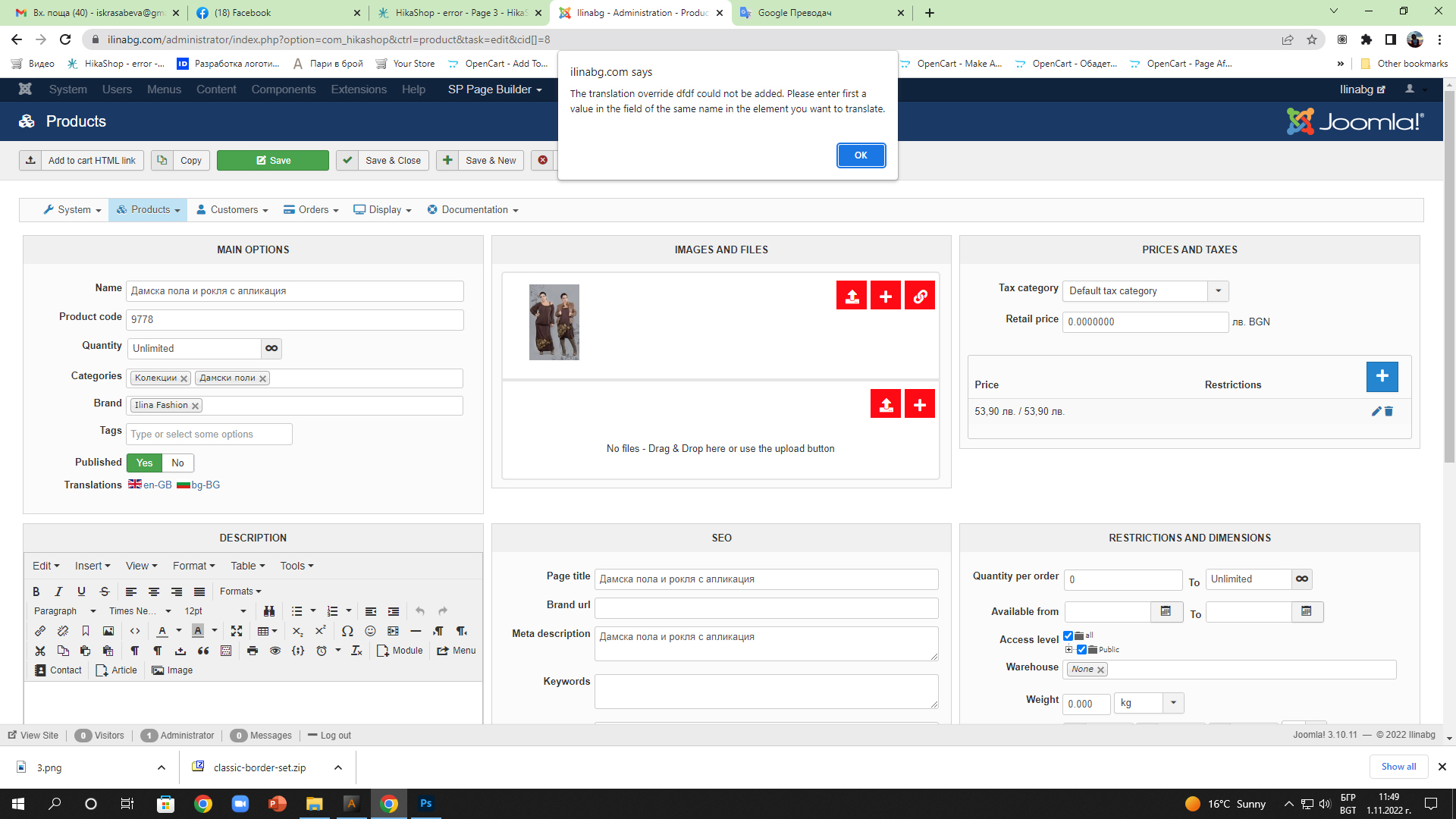 Please make sure that the "Non-latin translation keys" setting under the Languages tab of the HikaShop configuration is activated since your main language is not a latin language. Otherwise, the system won't be able to generate the translation keys from the main texts of your products and that's why you have that error I think.