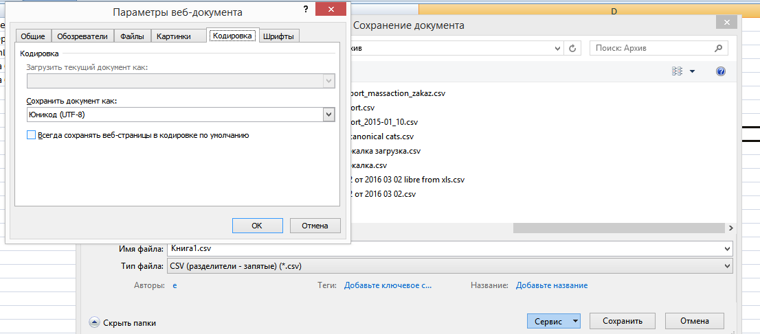 Файл -> Сохранить как -> Другие форматы -> CSV разделитель запятые, Сервис -> Параметры веб-документа -> Кодировка -> UTF-8 -> ОК, Сохранить, ОК, ОК