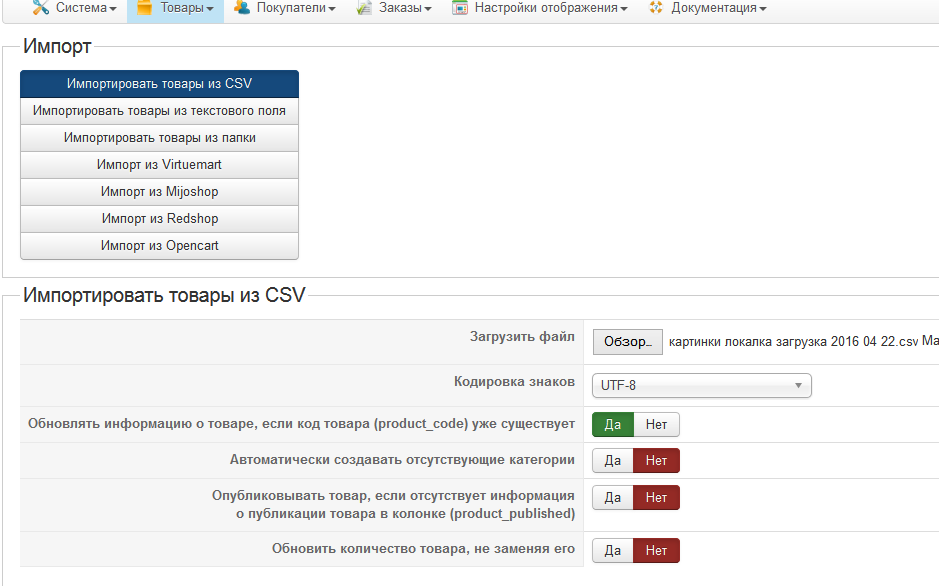 4. Импортируем наш файл в HikaShop: