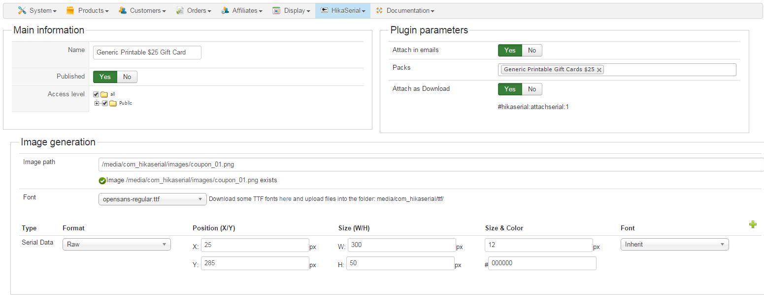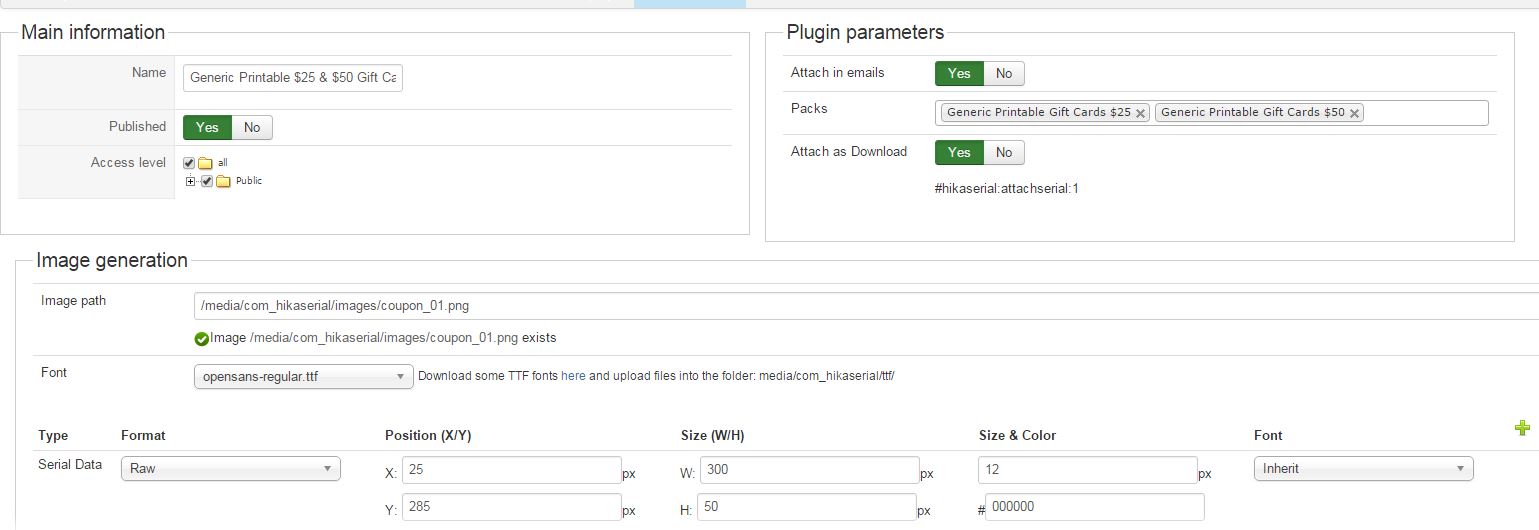 I uploaded a screenshot of the hikaserial configuration settings, hikashop product variant settings with the pack attached, the order which default is set to confirmed., pack settings, serial settings, and serial attach settings.