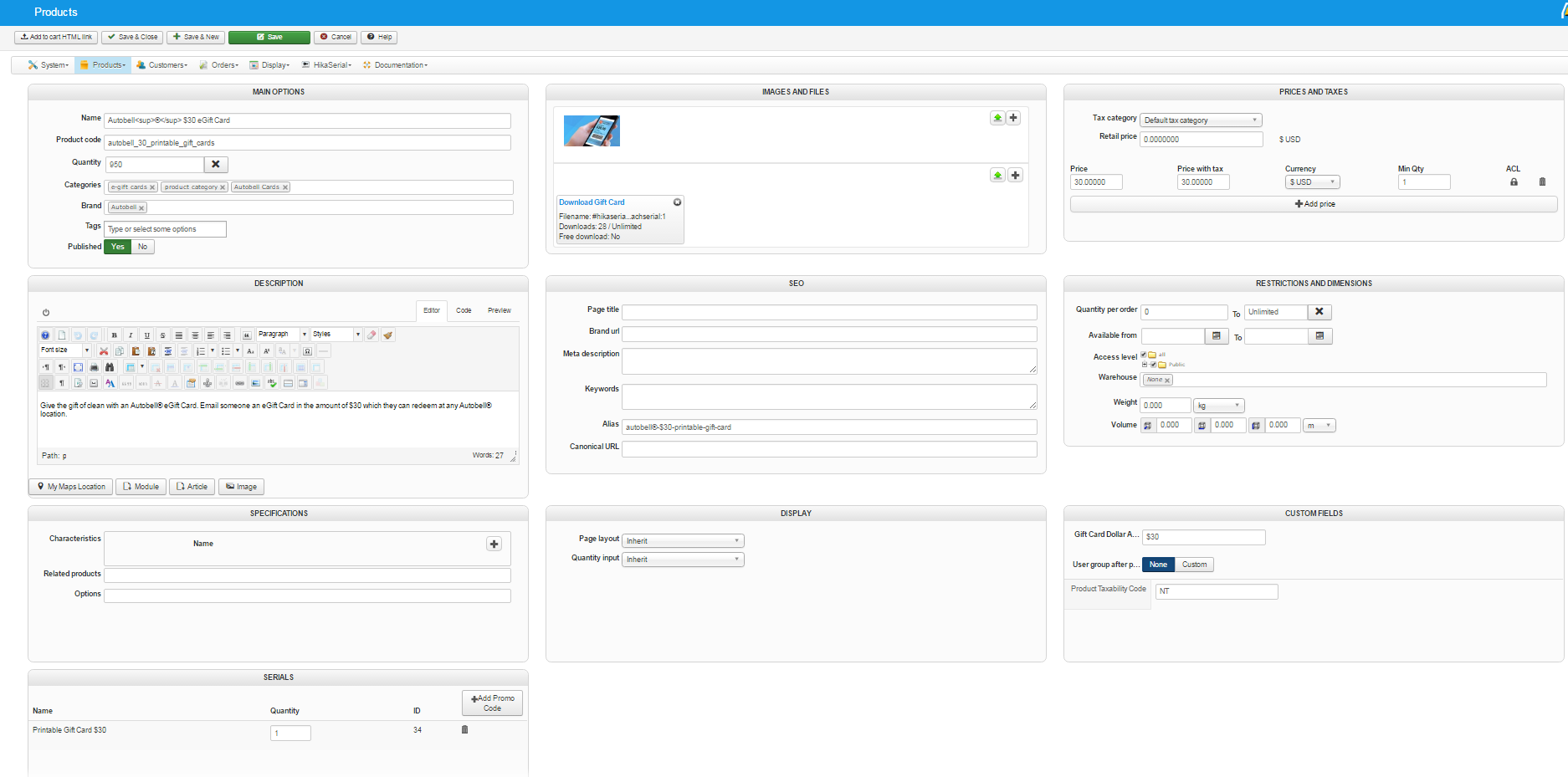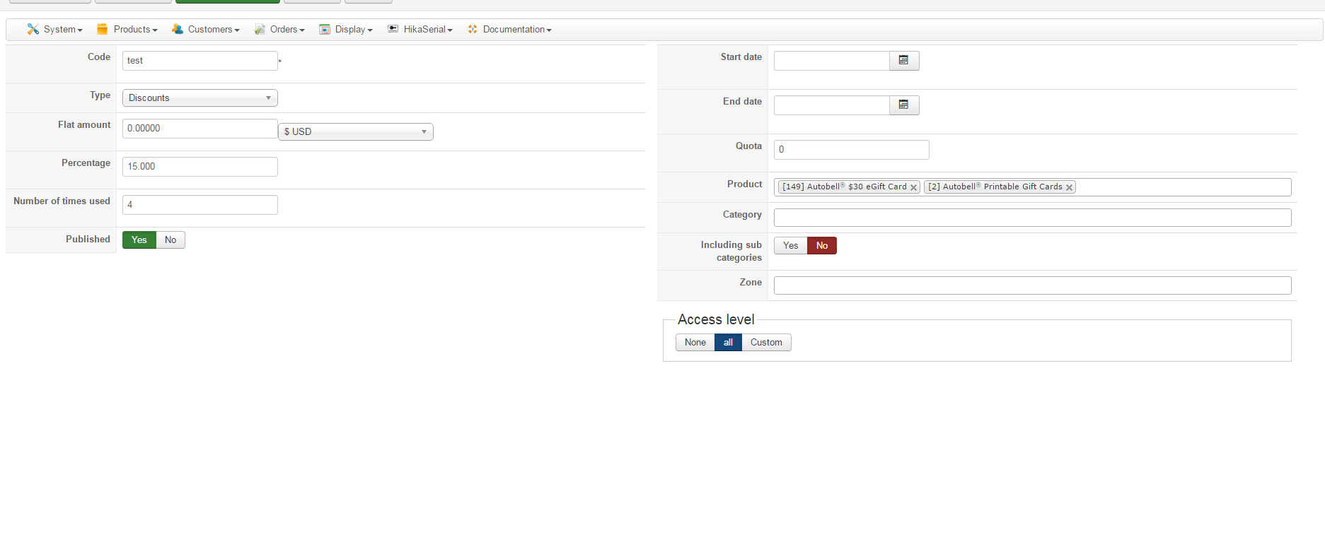 If you look through my previous post I have sent a screen shot of the discount set up, the product setup what the product looks like on the backend and front end of the product and a screenshot of the output from hikaserial itself.