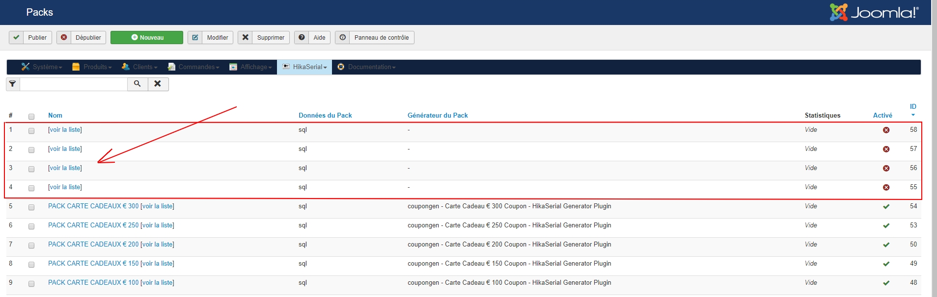 Voyant que vos 4 packs sont complètement vide (pas de nom ni de configuration) cela me donne l'impression d'un soucis avec un formulaire "vide" qui aurait été soumis.