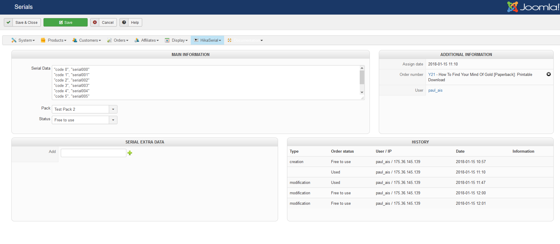 "code 1", "Serial001'