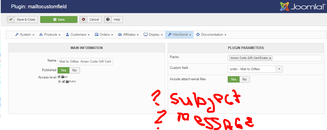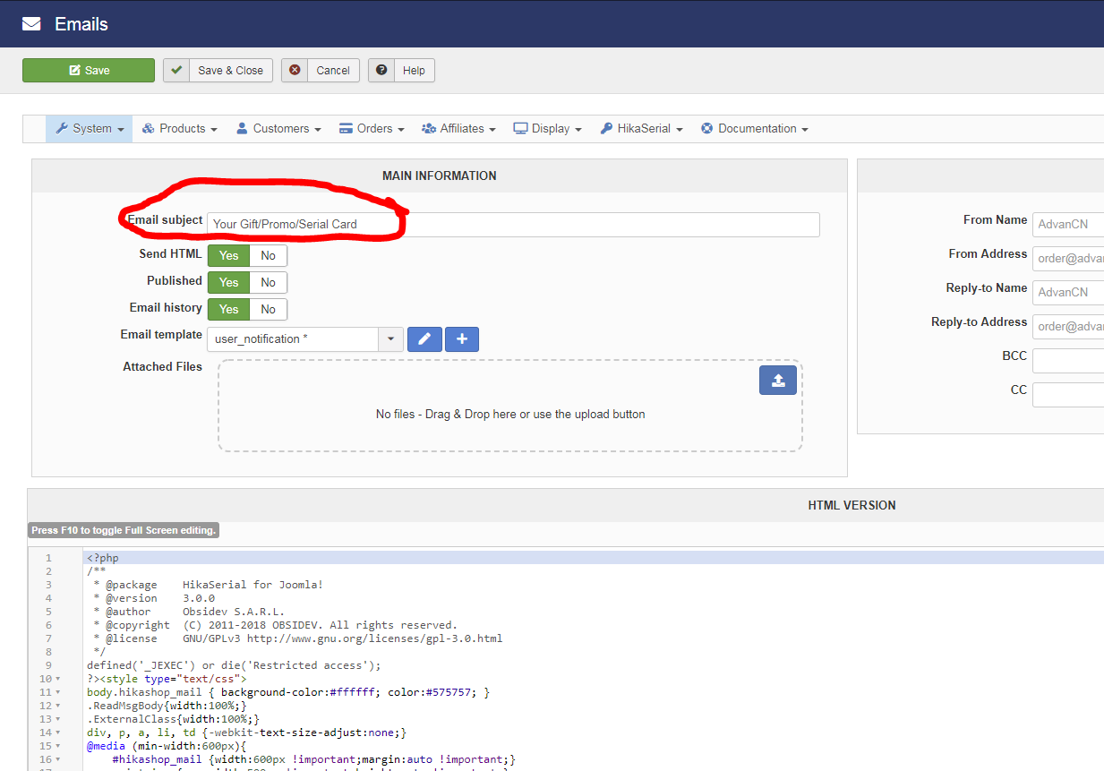 RE: 2 - If your "mail to custom field" is configured and you receive the email to the specified address, then you have to customize the corresponding HikaSerial email in the HikaShop backend (System > Emails) : "Serial: Mail to custom field"