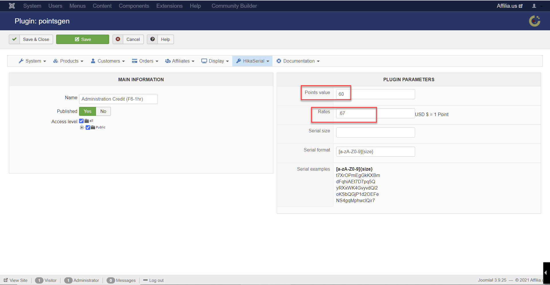 Please note that if you want the customer to earn directly the points on order confirmation, you need to use the HikaShop user points plugin, not the HikaSerial generator/consumer ones.
