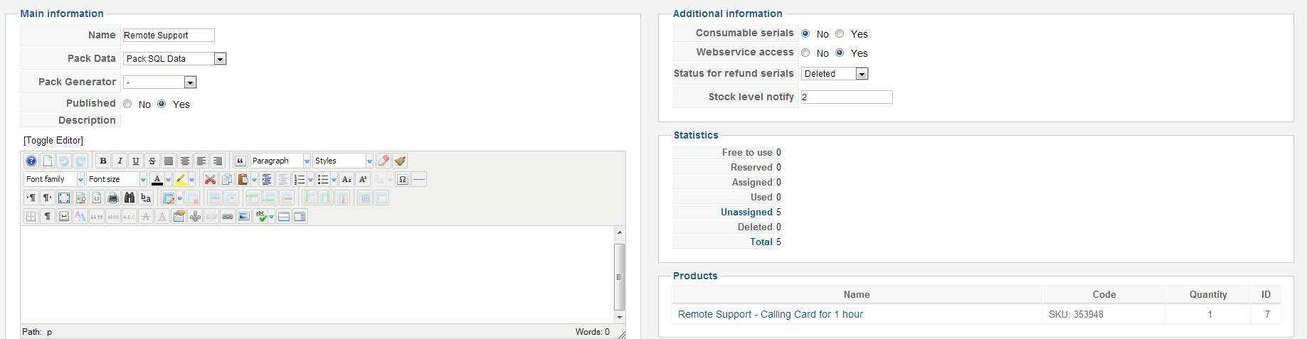 When "Link product quantity" is set to No, I update the product quantity manually and I can place an order but when I receive the confirmation email, it doesn't have the serial number attached. Also, I receive an email saying that "The pack Remote Support has a stock of only 0 serials", but I have 5 serials in the pack.