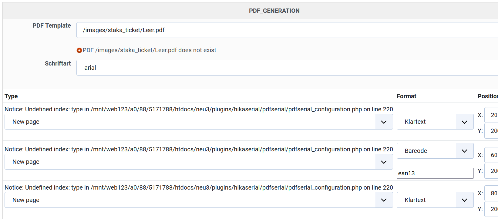Regarding the generation, if the plugin can't access the PDF template, it will be a problem. I recommend you to let the field empty for the moment ; your PDF won't have a template but it will create you a PDF from scratch.