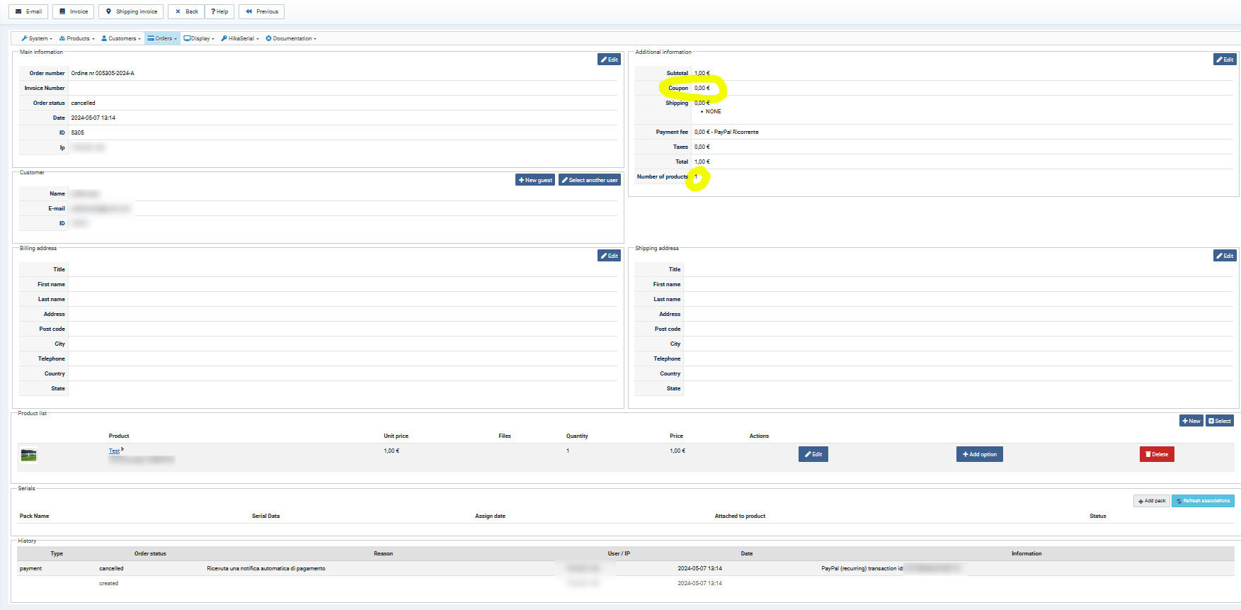 The first test, without coupon, went well, the order and the renewal order were done correctly.