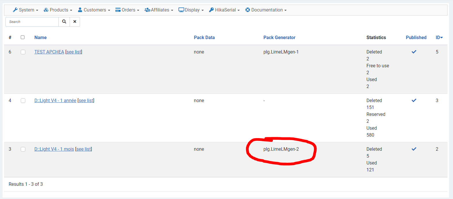 De plus quand on affiche les packs (capture 1), on voit le générateur ("plg.LimeLMgen-2") mais quand on ouvre le pack, le déroulant est vide (capture 2). Bien que je pense qu'on n'utilise plus ce mécanisme. Cela fait bien longtemps que je ne me suis pas replongé dans HikaSerial.