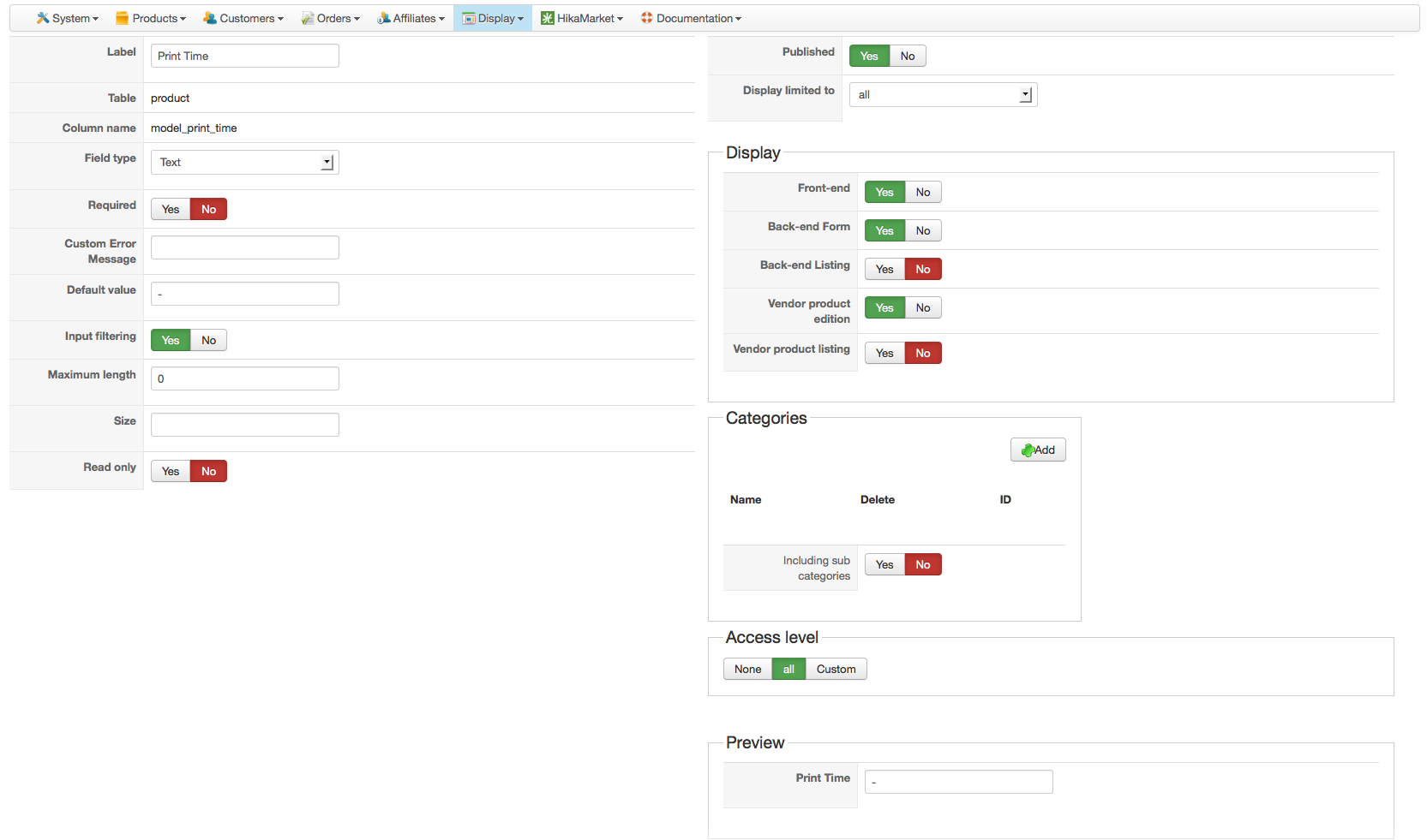 - Products have several custom fields. These are not visible to the front end vendor when they create a new product but are displayed in the product listing