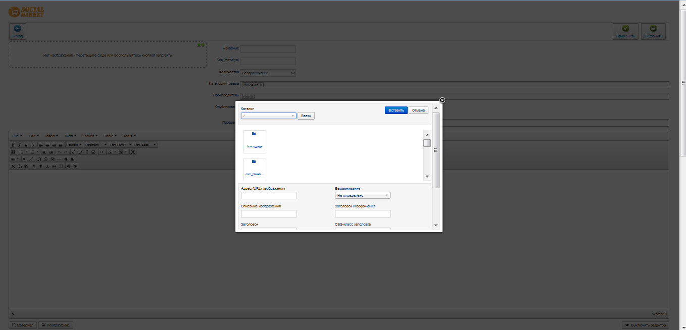 The "image" button that you can have with the WYSIWYG editors are provided by Joomla plugins and can't be manage or controlled by HikaMarket.