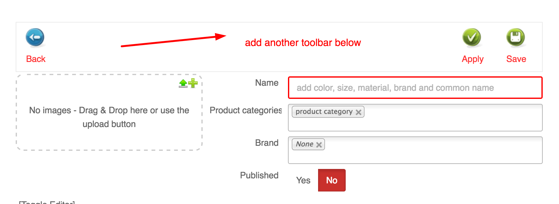 If you want to add a second toolbar in the view, you just need to put it at the beginning of "productmarket / form".