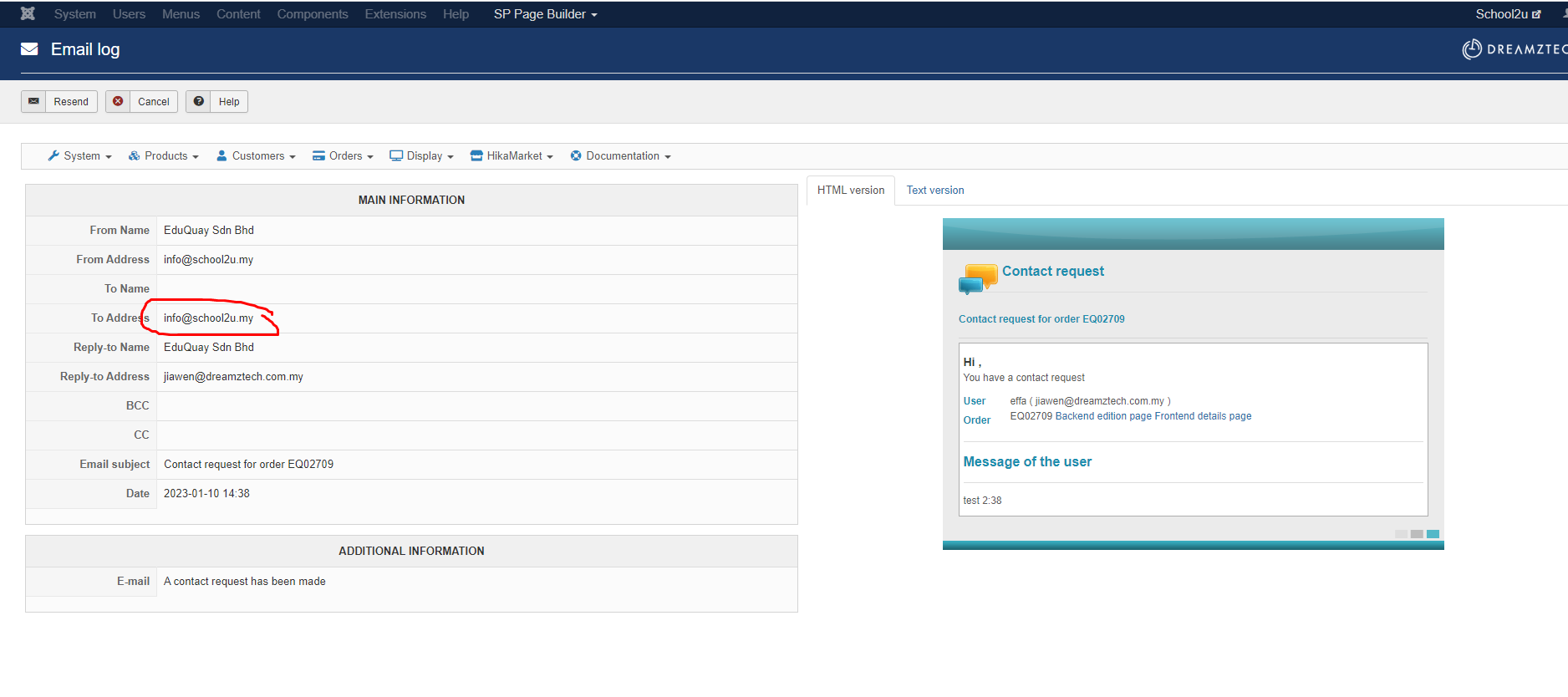 But the "contact us" in the order is not supported by HikaMarket, the main reason is that an order might not be handle by the vendor and that you can have multiple vendors in the same customer order.