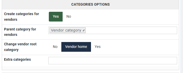 Change vendor root category No, Vendor Home, Yes (On Yes: Vendors default root category)