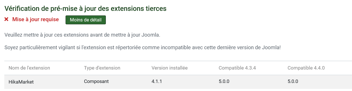 Lors du check d'avant mise à jour vers J4.4.0, Joomla me signale que Hikamarket doit être mis à jour.