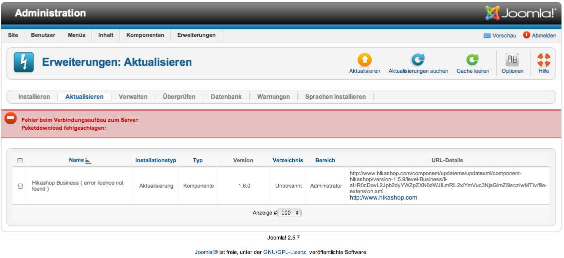 ich wollte in Joomla! 2.5.7 Hika aktualisieren und bekomme diese Fehlermeldung: