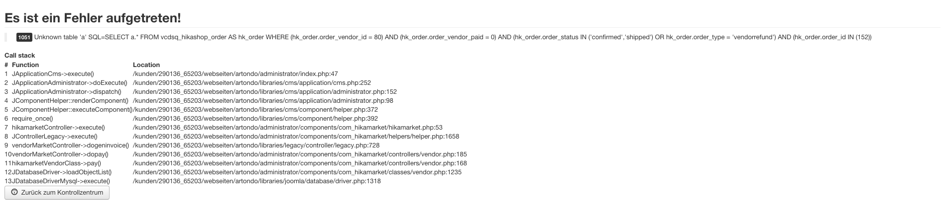 -- Error-message(debug-mod must be tuned on) -- : 1051 Unknown table 'a' SQL=SELECT a.* FROM vcdsq_hikashop_order AS hk_order WHERE (hk_order.order_vendor_id = 80) AND (hk_order.order_vendor_paid = 0) AND (hk_order.order_status IN ('confirmed','shipped') OR hk_order.order_type = 'vendorrefund') AND (hk_order.order_id IN (152))
