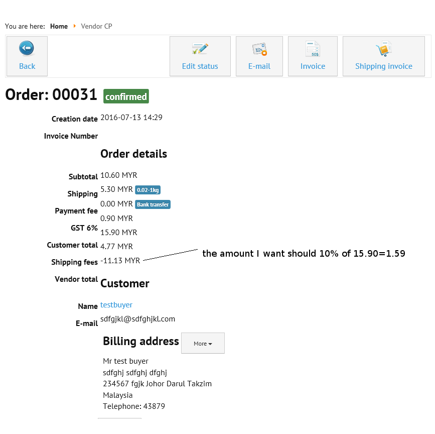10% commission of product should = 2.00 or (-2.00 negative mean vendor should pay me back the commission), the system calculate vendor total 2.00+8.00(shipping) while the shipping fee should belong to vendor.