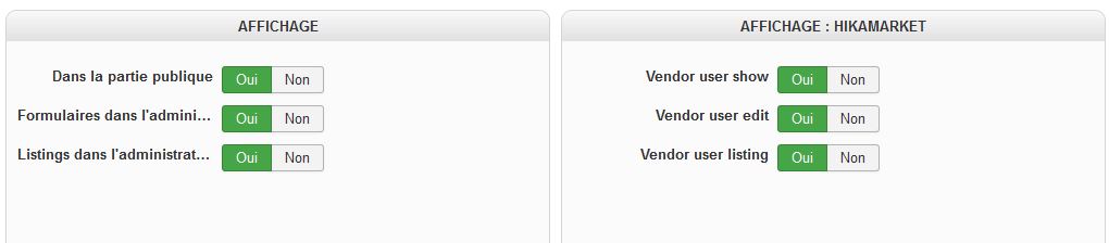 Dans la configuration de ces champs, j'ai bien activé l'affichage dans hikamarket: