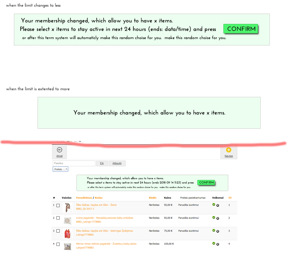 after users group is changed in his control panel / products tab appear notification :" Your membership changed, which allow you to have x items. Please select x items to stay active in next 24 hours (ends: data/ time ) or after this term system will automaticly make this random choise for you." (system leave active x items from list, all the rest become inactive after 24 hours, if vendor do not make his choice with CONFIRM). The time term (24 hours) could be made that in beck-end administrator enters his preferenced time in hours. In product list near each product the check box appear to select and the button "confirm" (the place for button I would suggest near the notification or even inside notification border). The select limitation according group limitations (if Autors group allows to have 3 items, then user can select to confirm only 3 items). After press confirm , slected items stays active, all the rest inactive ,but visible. Near inactive items could be notification something like " if you would like to activate inactive items, please change your memebership + link to membership page (selected menu:hikashop category, where vendor can buy the membership)