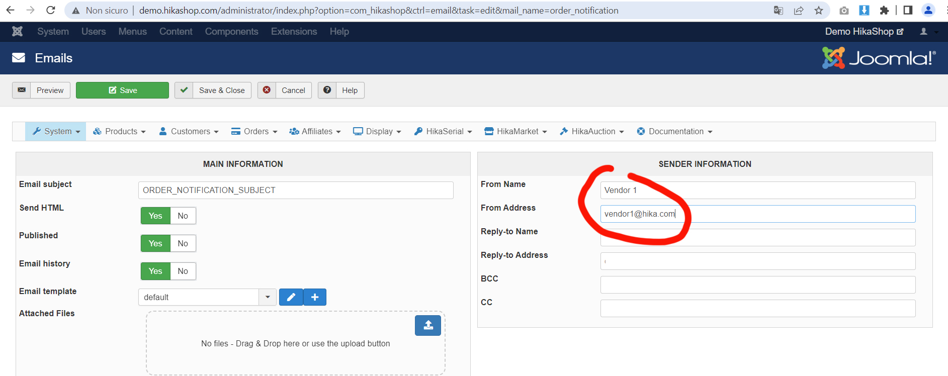 As I wrote you in another thread, you already have the vendor attributions in the HikaShop mail data.