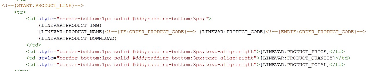 But it's even simpler. You just have to add the tag {LINEVAR:PRODUCT_CODE} after the tag {LINEVAR:PRODUCT_NAME} and you'll get the product code after the product name in the email.