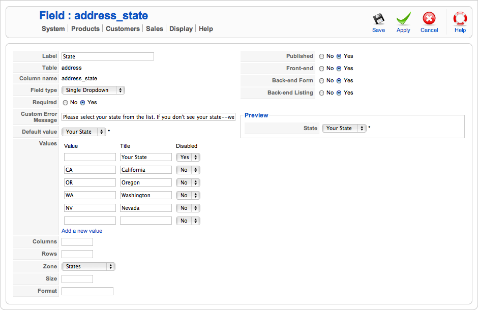 Table: address; Column name: address_state; Label: State; Field type: Single Dropdown; Required: check; Order: 8; Front-end: check; Back-end Form: check; Back-end Listing: --; Published: check; Core: check; ID: 12