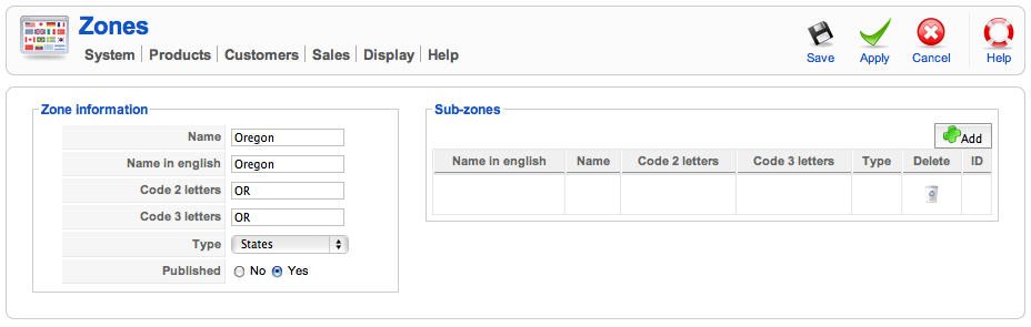 Zone: CA; Rate: CA(9%); Customer type: blank (I set this to all customer types when I set it up); Published: check