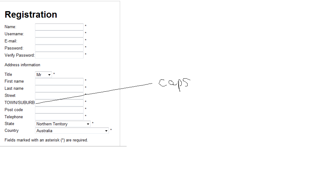 Basically what I'd like to do is have Suburb as a required field, however, when I enter the information, it still renders all in capitals i.e. TOWN/SUBURB