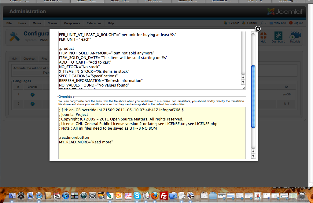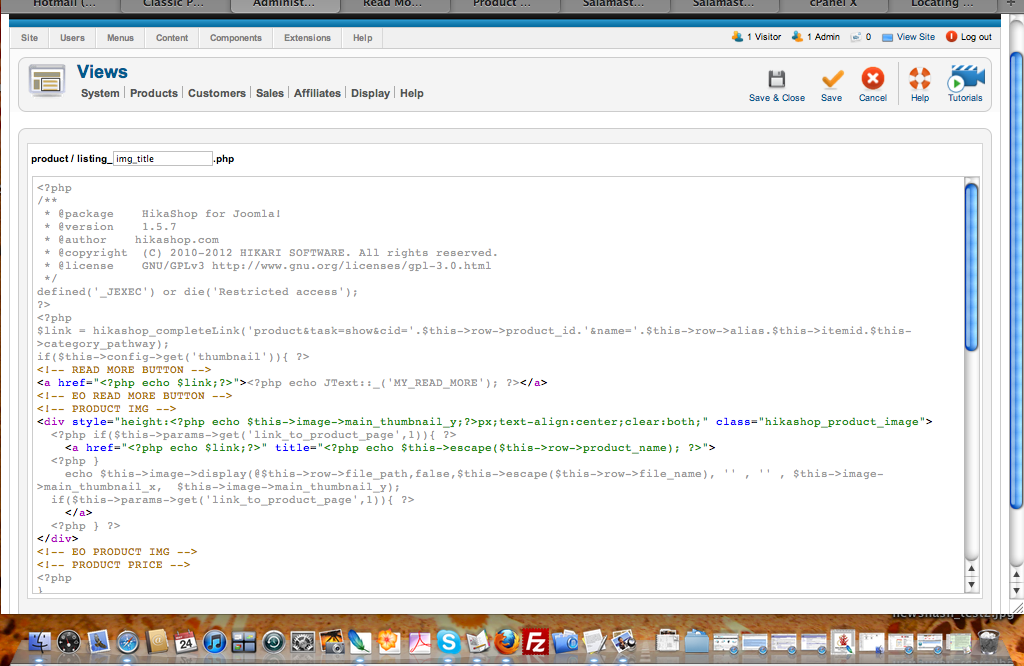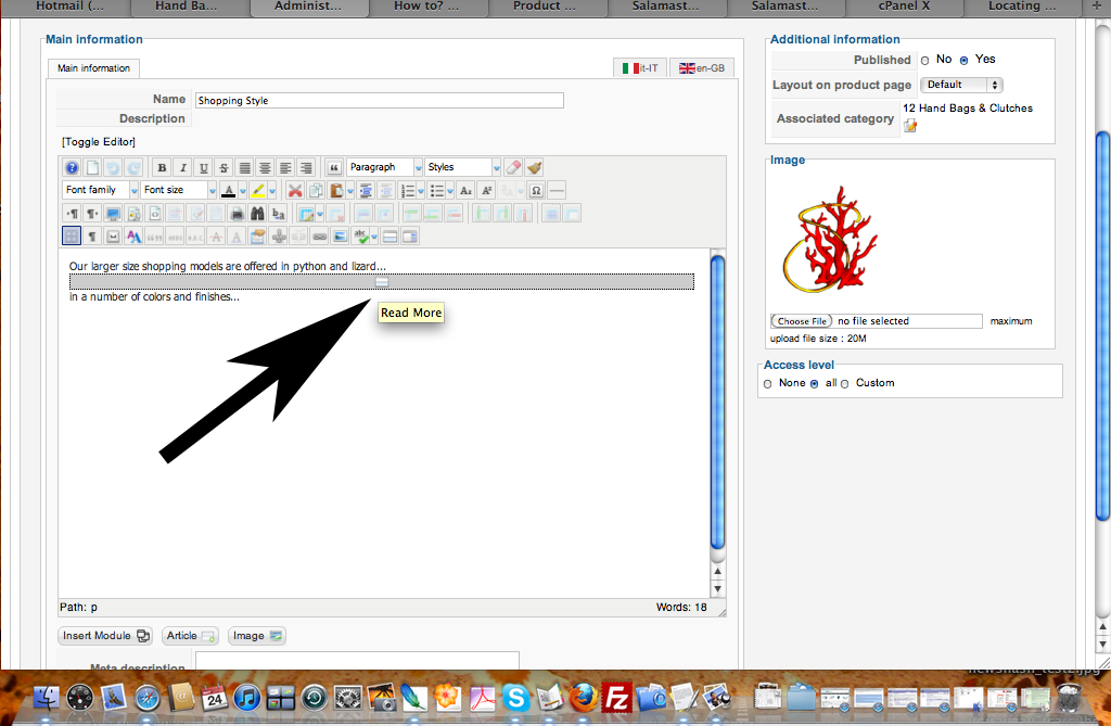 Regardless, I tried to follow your post above and hacked the two files as instructed [see pics], however, I must be missing something further steps to finish the job... I also tried to insert the above tag [<hr id="system-readmore" />] into my text editor and instead of displaying a read more button on the category listing page, it displayed the button directly on the editor page and html code on front end. To make matters worse, I am still a bit confused on all the options for categories and products listings and could be making some errors there as well.