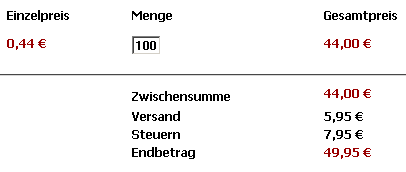 Here you see the price per pcs. of 0,44€ with tax. So for 100 pcs. 44,-€. Then the shipping with 5,95€ incl. tax and the endprice incl. tax is 49,95. And now the big difference at the tax, with 7,98€ its right in this calculation.