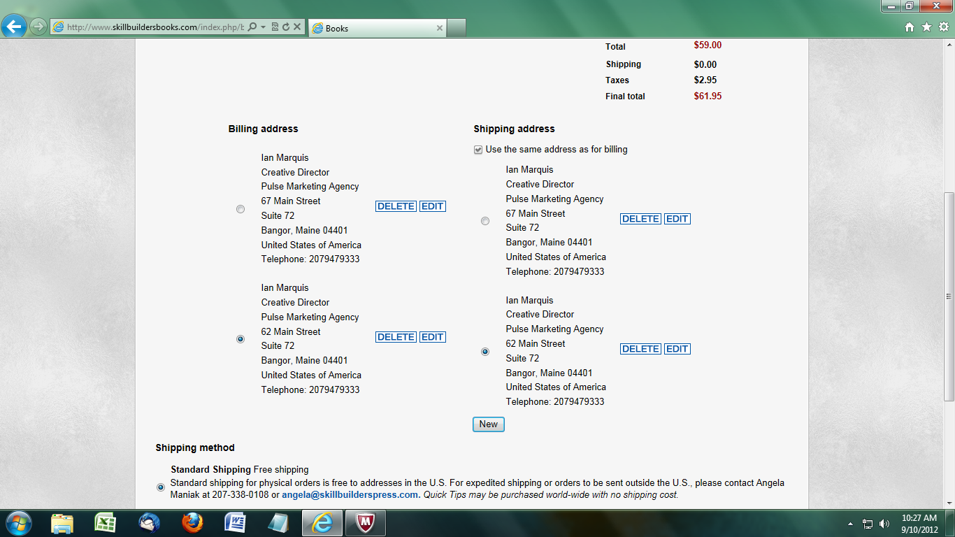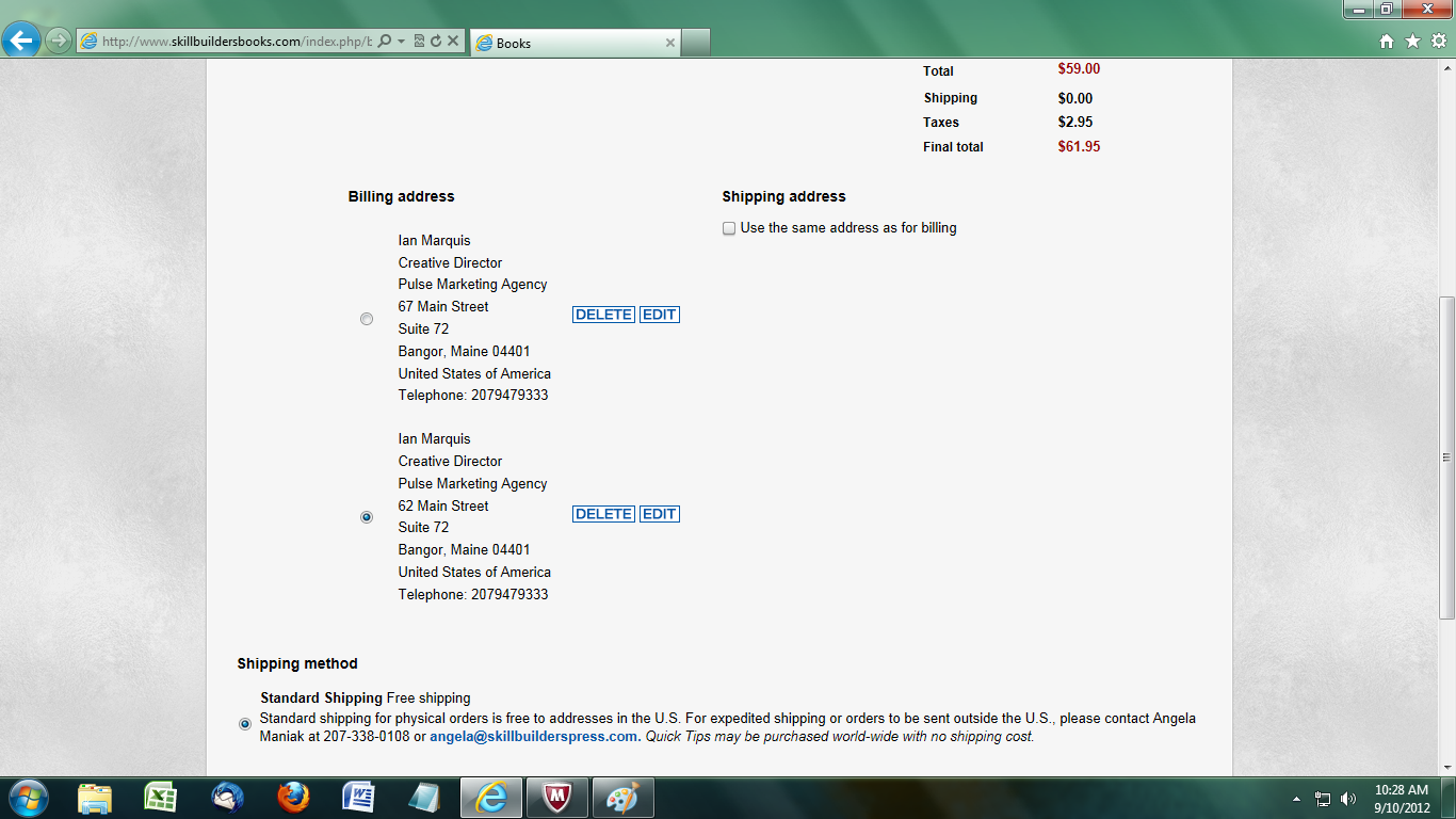 The issue is with regard to the "Use the same address as for billing" checkbox during the checkout process. This checkbox functions as expected in the latest versions of Chrome, Safari, and Firefox, but is not working correctly in Internet Explorer 9. Instead, the checkbox does nothing when unchecked (it should be revealing the address and the edit/new buttons). When it is rechecked, the second address and buttons vanish - it appears the checkbox is operating in reverse. I am attaching two screenshots illustrating the issue in action.