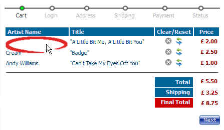 2. I have replaced the 'Image' column in my checkout cart (checkout / cart.php) with a custom product field - 'Artist Name'. Having adjusted the code the changes work, but the first cell of that column is always blank. If I add further items to the list, the Artist Name field populates as expected from the second row onwards, if I delete an item from the first row, the Artist Name for the second row item disappears when it moves up. The code snippet is below - please advise how to adjust the code to rectify my error. Image attached.