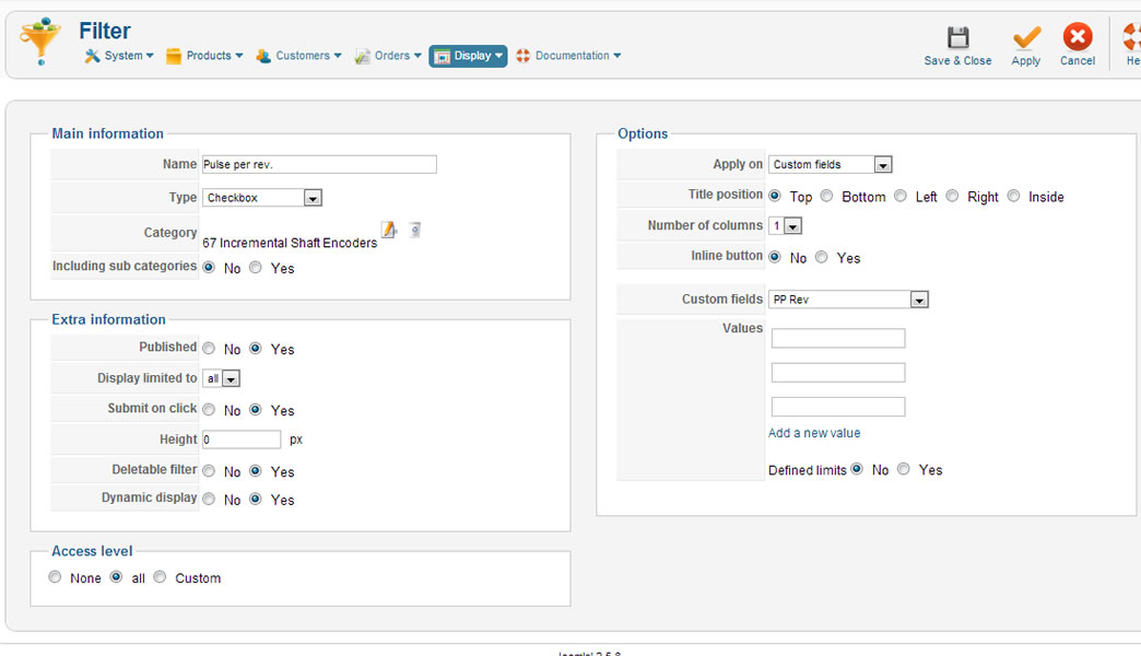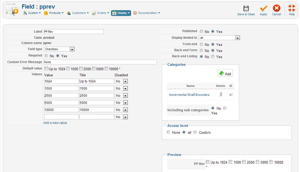 Hi there. My client has products (industrial machinery parts) with custom fields such as 'Maximum RPM'. Values for this can range from 100, 200, 300, 600 or 800. Now, a product that has a maximum RPM of 800 can also have an RPM of just 100 (and any RPM between 0 and 800). Whereas a product with a maximum RPM of 300 cannot have a RPM of 800.