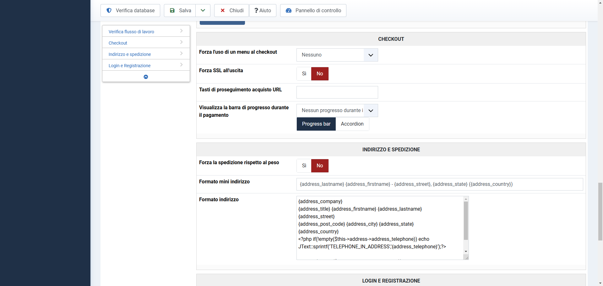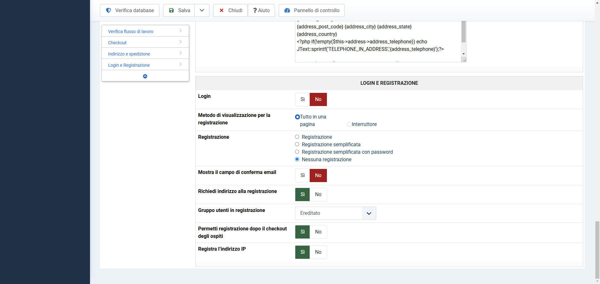 4. Supposing you don't want a login form and a registration form, you can set the "Registration" setting to "guest" and turn off the "login" setting under the Checkout tab of the HikaShop configuration. That way, the checkout will only provide a guest form where the user can provide his email address and physical address. No more login, and no more registration. Maybe that's what you want to do ?