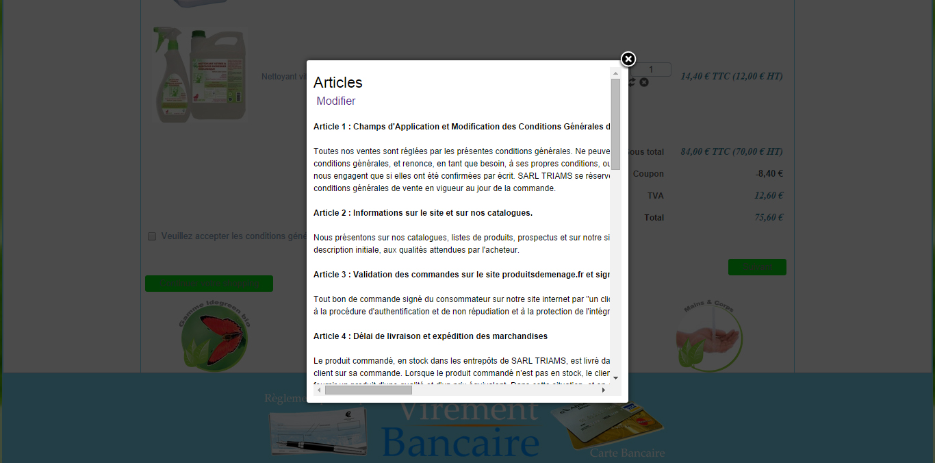 Bonjour, pardon je rebondie sur le post de Greniers, dans mon panier, moi je ne voie aucuns lien vers les conditions générales de vente malgré avoir donné le lien vers l'article ? il y a un codage ou une chose que j'ai oublié ?
