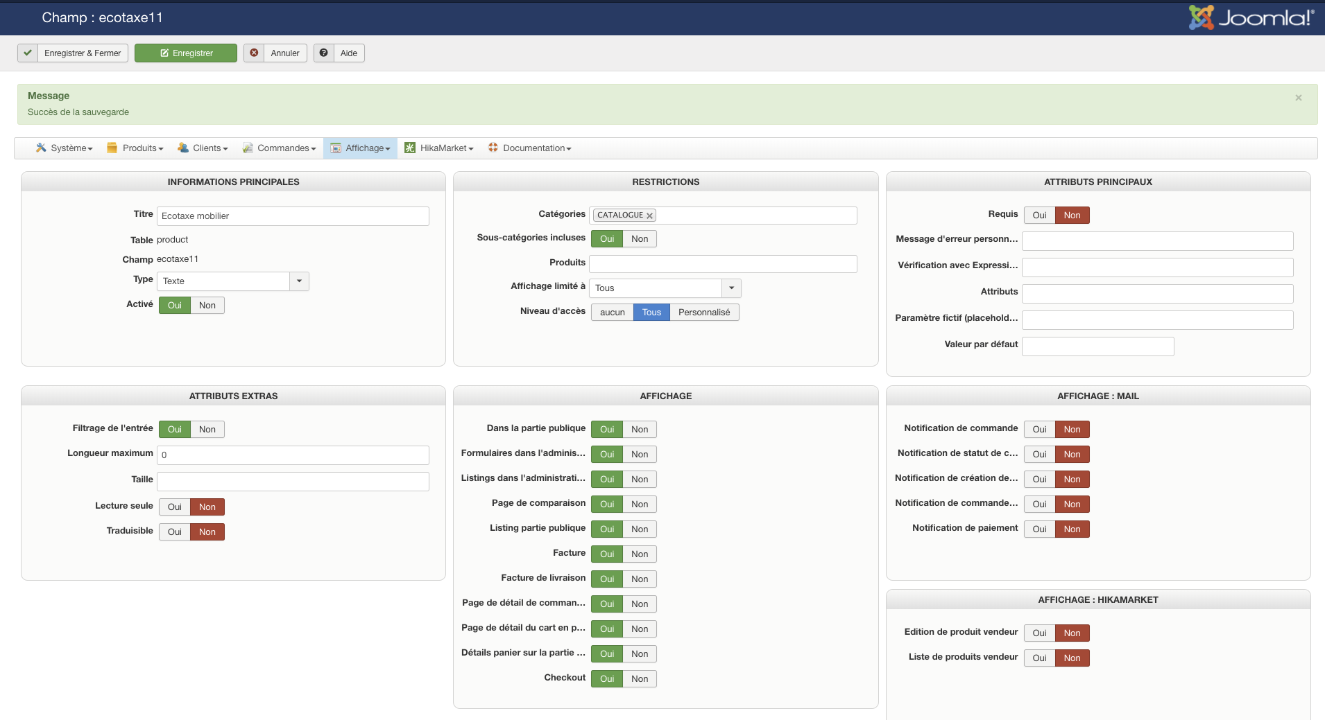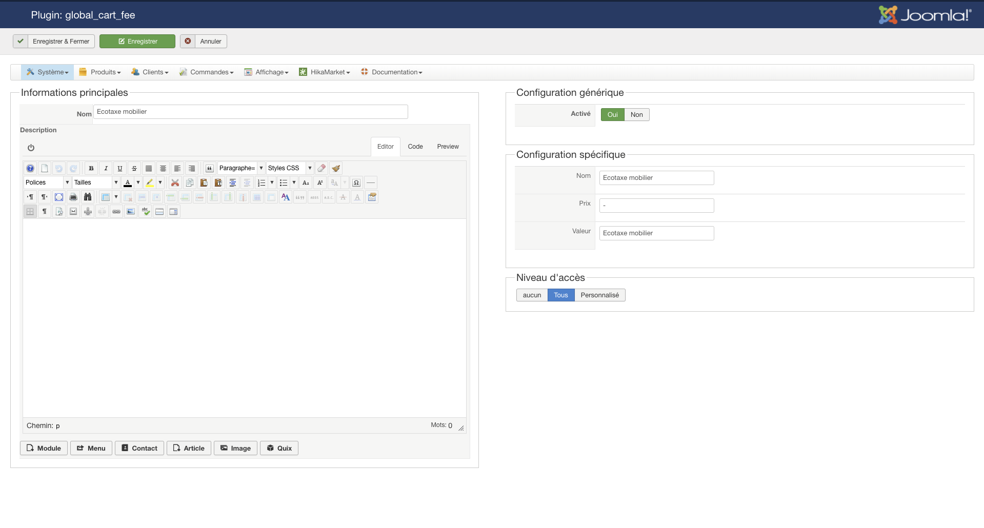 Dans ses options, entrez le nom de votre taxe dans le champs "name", dans "price" entrez soit + soit - si vous voulez que l'écotaxe s'ajoute au prix des produits ou soit considérée comme déjà incluse, et dans "value" vous pouvez mettre le nom de colonne d'un champs personnalisé de la table "produit" (que vous pouvez configurer via le menu Display>Custom fields.