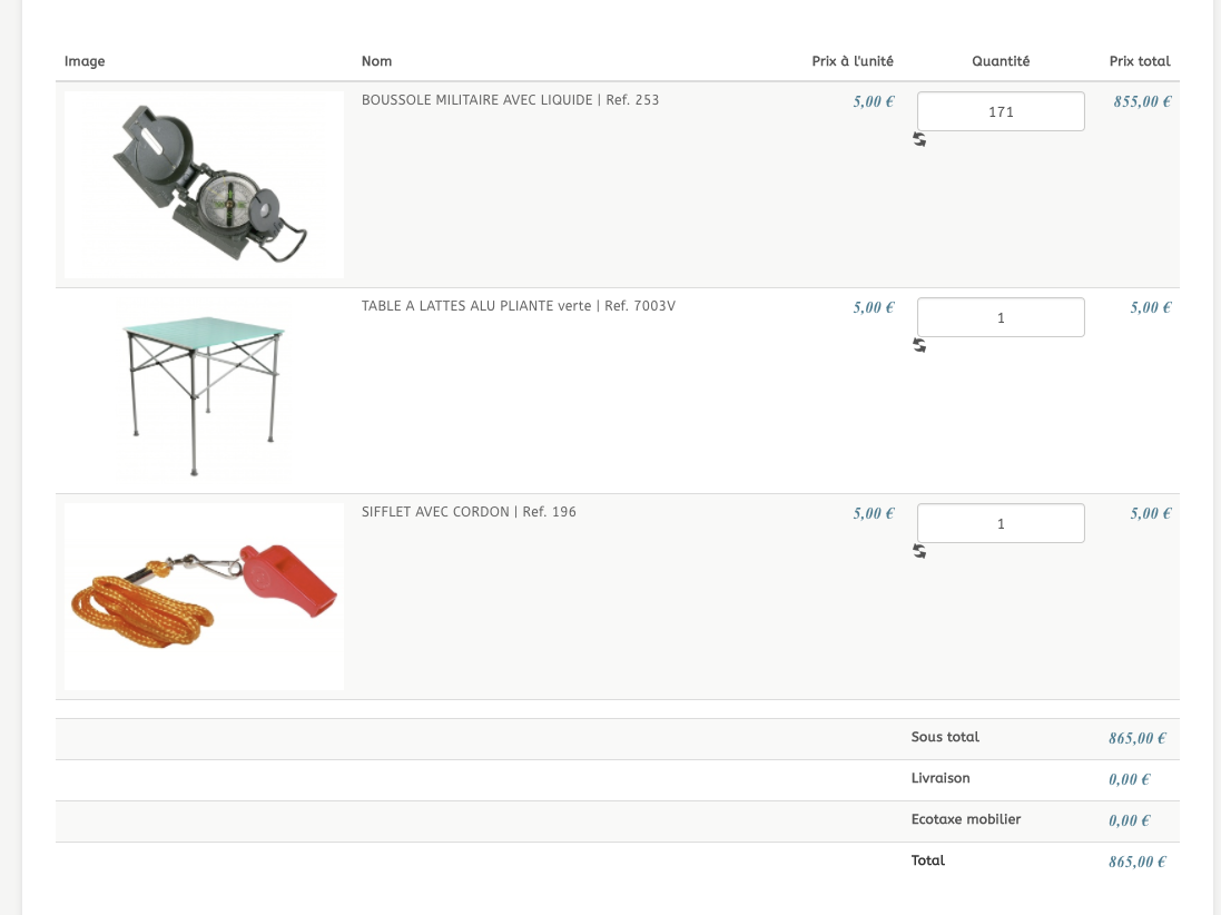 Ainsi, durant le passage en caisse, en dessous du sous total des produits, une ligne sera rajoutée pour l'écotaxe avec la sommmes des valeurs entrées pour chaque produit du panier.