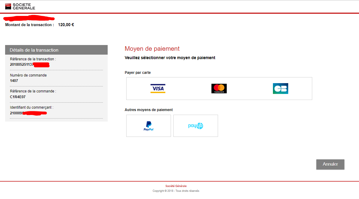 Avec cette simple modification, les paiements passent "comme une lettre à la poste" sur SocGen (cf. copie d'écran). Sinon "gros message rouge" indiquant une erreur.